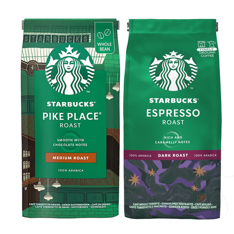 یک ترکیب رویایی از طعم و عطر قهوه با پودر قهوه اسپرسو ESPRESSO ROAST با رست دارک و صد در صد عربیکا و وزن 200 گرم و دانه قهوه PIKE PLACE با رست مدیوم و 100% عربیکا و وزن 200 گرم .