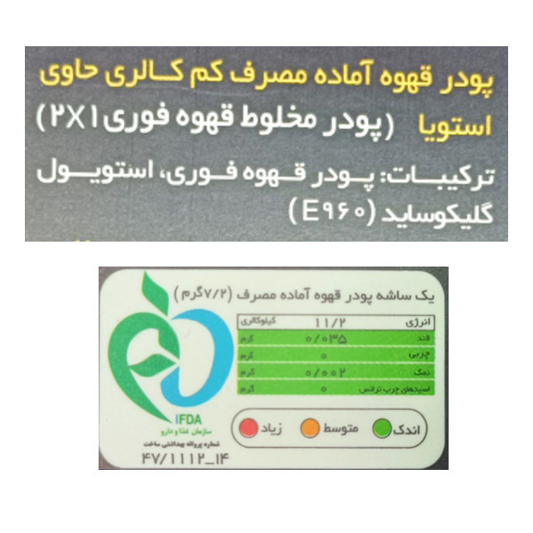 استویا نوعی شیرین کننده طبیعی است که کالری کمی دارد. هر ساشه این محصول چیزی حدود 11 کالری دارد. هر جعبه دارای 20 ساشه پودر قهوه بدون شکر و کم کالری است. این پودر قهوه برای دیابتی ها بسیار مناسب است. همچنین ورزشکاران در جهت بالا بردن سرعت سوخت و ساز می توانند به عنوان وعده قبل تمرین قهوه بدون شکر را مصرف کنند. شما می توانید هر ساشه از این قهوه را به همراه 100 میل آب با دمای حداکثر ۸۰ درجه مخلوط کرده و میل نمایید.