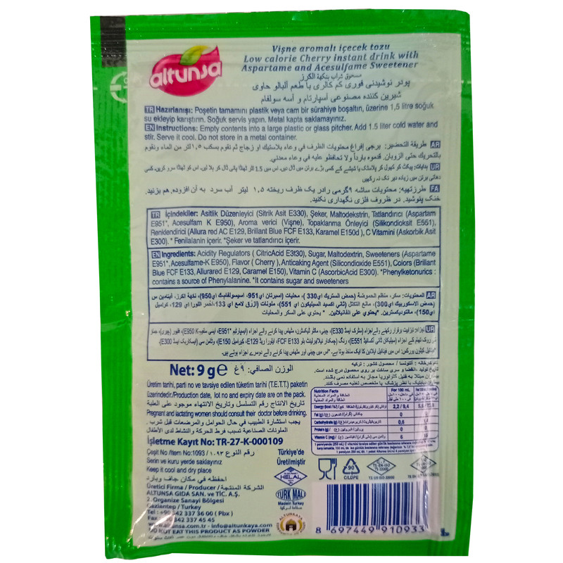 وزن بستهبندی12 گرمابعاد بستهبندی11x7x1 سانتیمترشماره پروانه بهداشت21/17900روش مصرفهر بسته را در 1.5 لیتر آب سرد بریزید و هم بزنید.حجم1.5نوع بستهبندیساشهنوع شربتآلبالووزن9 گرم
