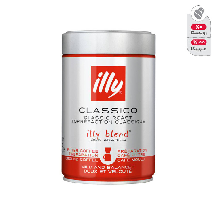 پودر قهوه ایلی مدل Classico ترکیب مخصوص 100% عربیکا ایلی (illy blend 100% Arabica) رُست متوسط درجه آسیاب درشت ساخت ایتالیا