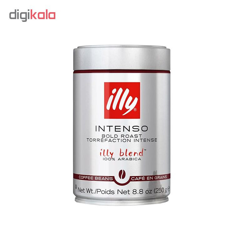 دانه قهوه ایلی دارک روست illy Bean Dark Roast Coffee ترکیب 100 % عربیکا (illy blend ایلی بلند) قوطی 250 گرمی دانه قهوه دارای طعمی عمیق و کامل و ته مزه کاکائو و میوه خشک مناسب برای انواع روشهای دم کردن قهوه محصول کشور ایتالیا