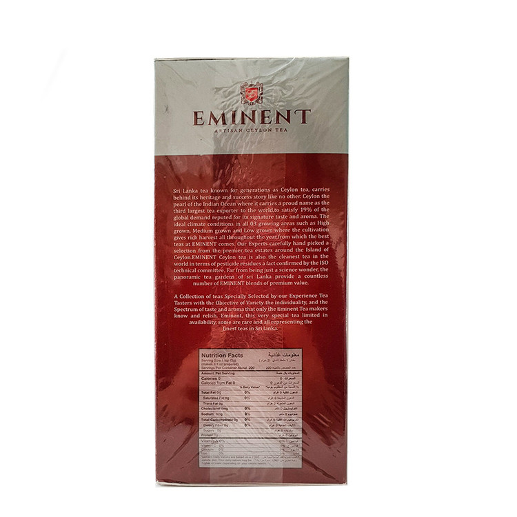 چای امیننت مدل صبحانه انگلیسی 500 گرمی محصولی از برند امیننت کشور سریلانکا کی باشد. چای امیننت بدلیل عدم استفاده از هرگونه کود و سموم شیمیای در تمام مراحل تولید بعنوان پاکترین چای جهان شناخته شده است . چای صبحانه انگلیسی یکی از معروف ترین ترکیبات چای در جهان می باشد .این چای در انگلیس دارای طرفداران زیادی می باشد و چای سنتی این کشور محسوب می شود. این چای از ترکیب چند نوع شامل چای سیاه و آسام و گاها کنیا تشکیل شده است که به دلیل طعم قوی و غنی آن معمولا در وعده صبحانه مصرف می شود . این چای معمولا همراه شیر و شکر مصرف میشود که این کاملا سلیقه ای می باشد.