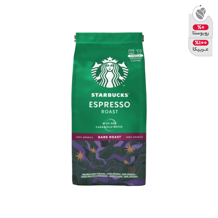 پودر قهوه استارباکس مدل ESPRESSO Roast ترکیب 100٪ عربیکا رُست تیره نُت کارامل آسیاب ریز مناسب اسپرسو بستهبندی STARBUCKS FlavorLock